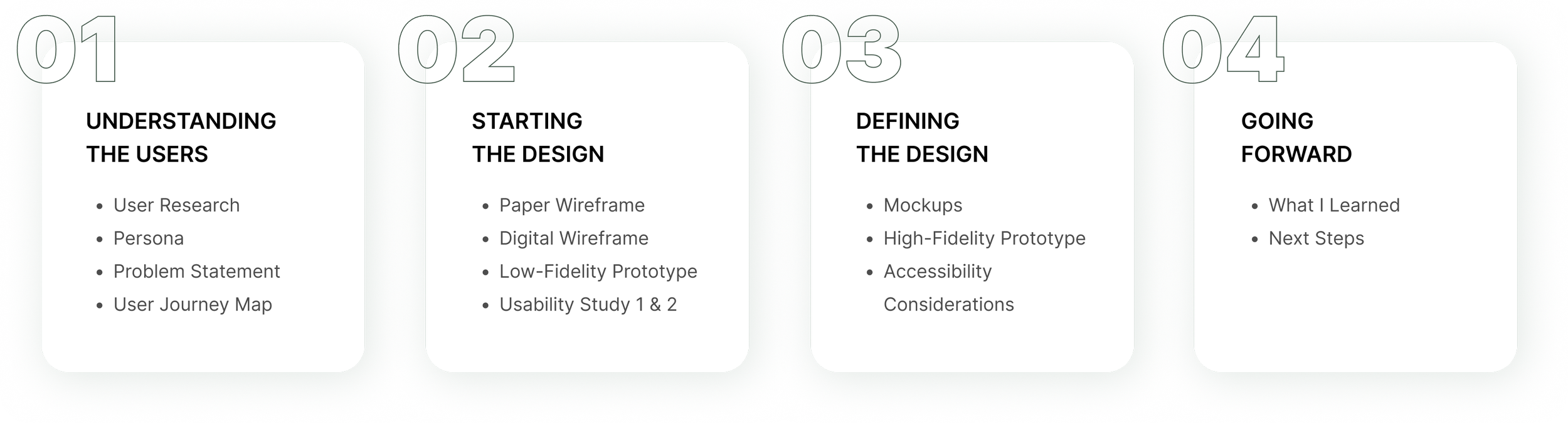 User Research, Persona, User Journey Map, User Flow, Wireframing, Prototyping, Usability Testing, Visual Design