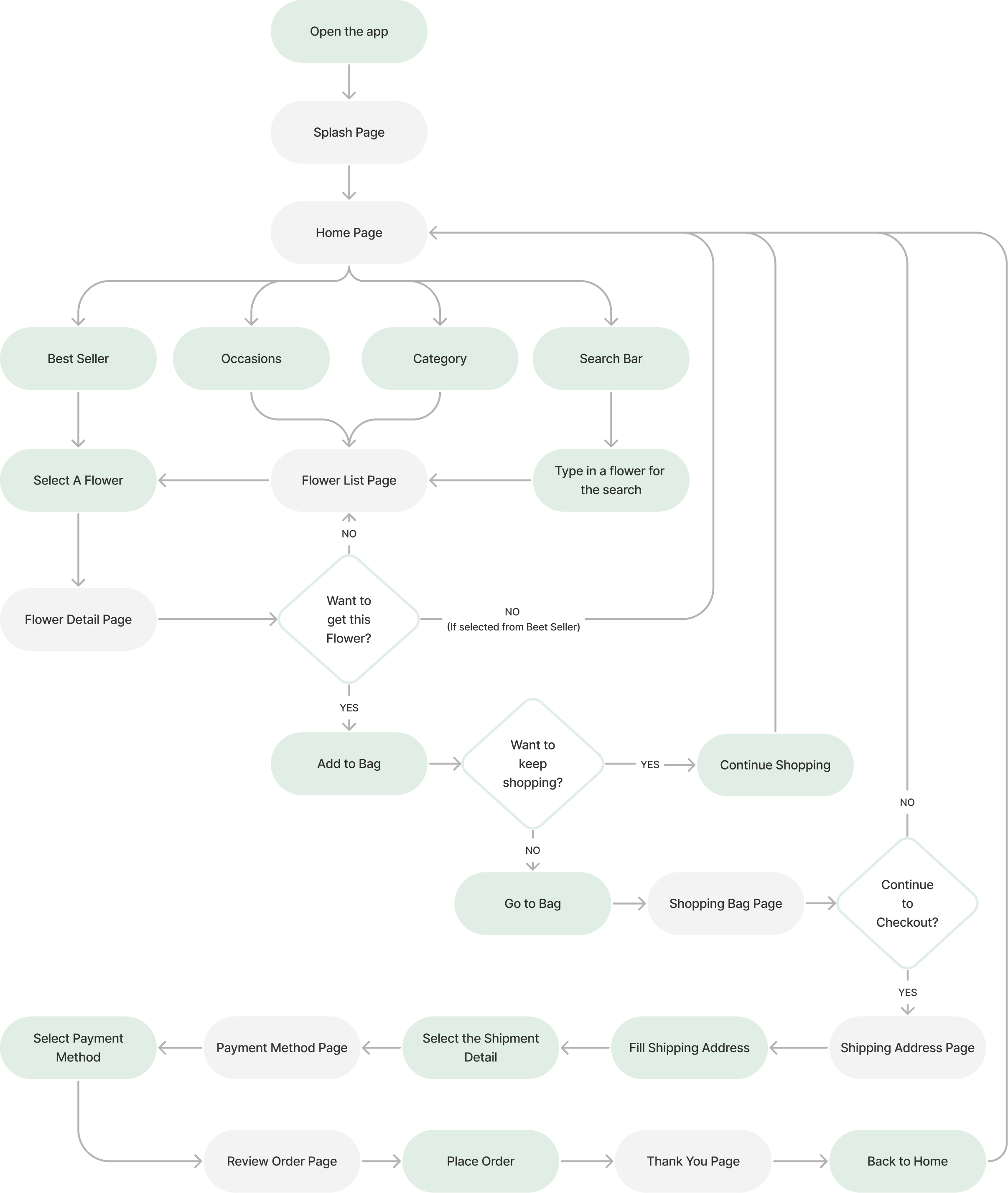User flow: users can use the search bar or category section to easily find the flowers that they are looking for, and view the flowers details, then add to cart and review the items. Also, there is a message card can be added to the order. Finally, users can move on to check out and place the order, and receive the order number.