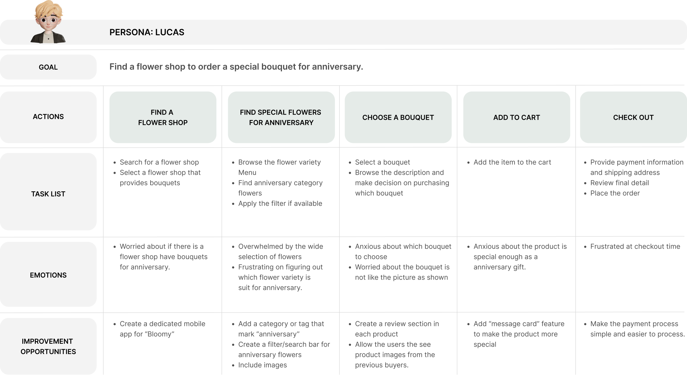 Mapping Lucas’s user journey to show the benefits for users to have access to a dedicated Bloomy florist app